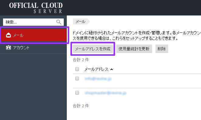 左のメニューから『メール』をクリックし、『メールアドレスを作成』をクリックします。